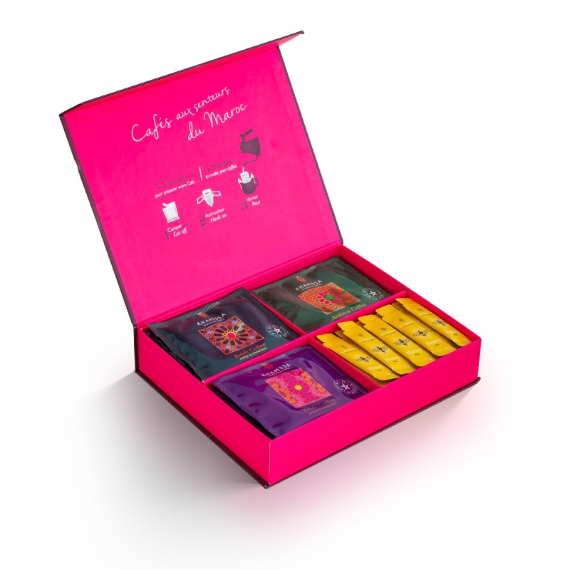 The Khamssa set is the perfect gift for coffee lovers. Available in three different colors (blue, pink and purple), this set is composed of three kinds of drip coffee bag as well as honey to sweeten the coffee without altering its taste.
