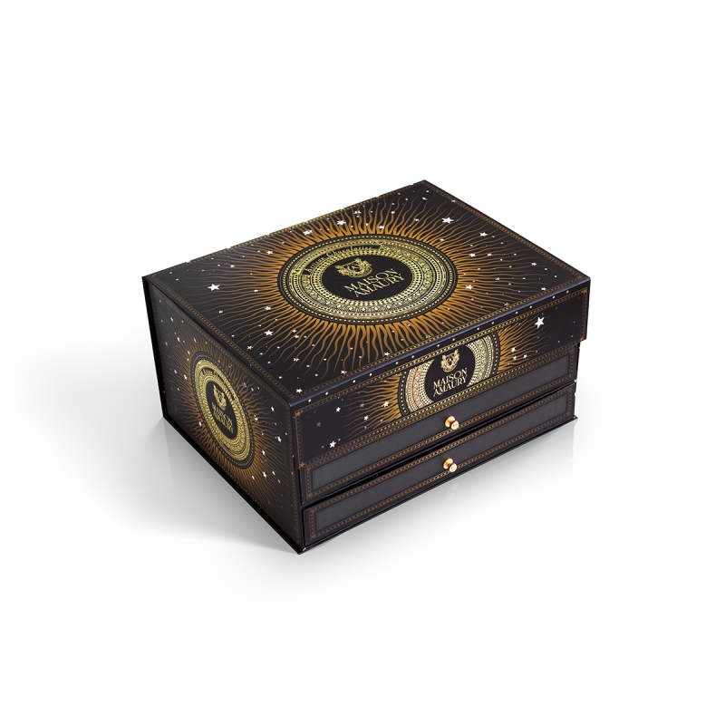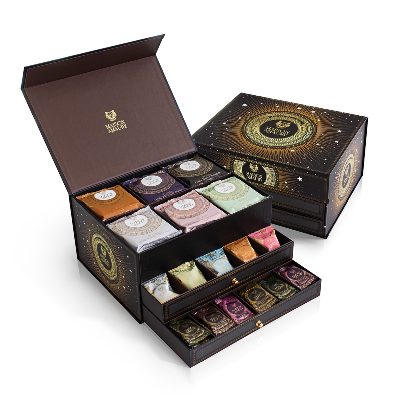 The 'Salon de la Lune' gift box contains three drawers, each filled with juicy dates, delicious napolitains, and crispy wafers. A perfect treat for gifting or enjoying.