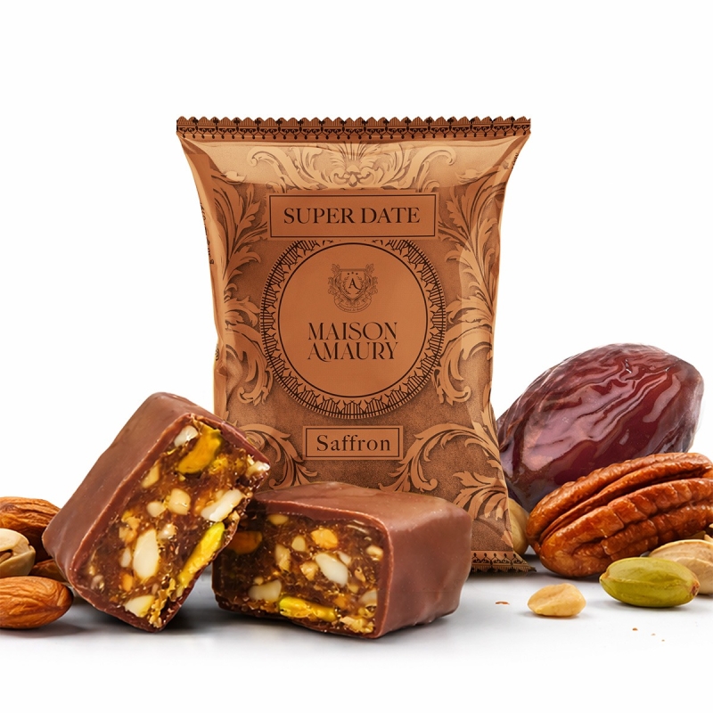 A blend of Mejhool dates, saffron honey, dried fruits, and chocolate creates a spicy and indulgent experience. Vibrant and energizing, each bite awakens the senses with warmth and refinement.