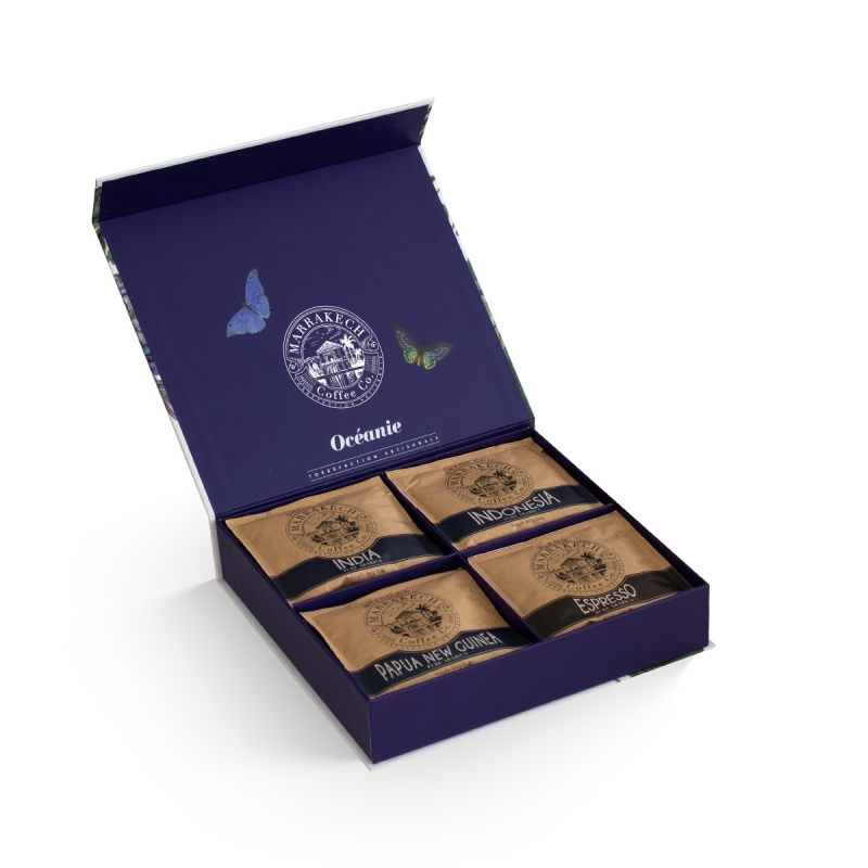 Le coffret Océanie de Marrakech Coffee offre une expérience sensorielle exceptionnelle, mettant en avant quatre références soigneusement sélectionnées : l'Inde, la Papouasie-Nouvelle-Guinée, l'Indonésie, et une quatrième référence mystérieuse à découvrir. Chaque tasse propose une immersion unique dans les arômes et les saveurs caractéristiques de ces terroirs océaniens, offrant ainsi un voyage gustatif captivant pour les amateurs de café en quête d'authenticité et de découvertes exquises.