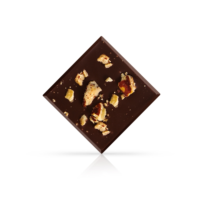 Napolitain Chocolat Noir aux Noix de Pécan vous invite à explorer le sommet de la gourmandise. Façonné avec expertise et élaboré avec des fèves de cacao de qualité supérieure, chaque carré incarne l'union parfaite entre le chocolat noir, riche à 70% de cacao, et le subtile croquant des noix de pécan.