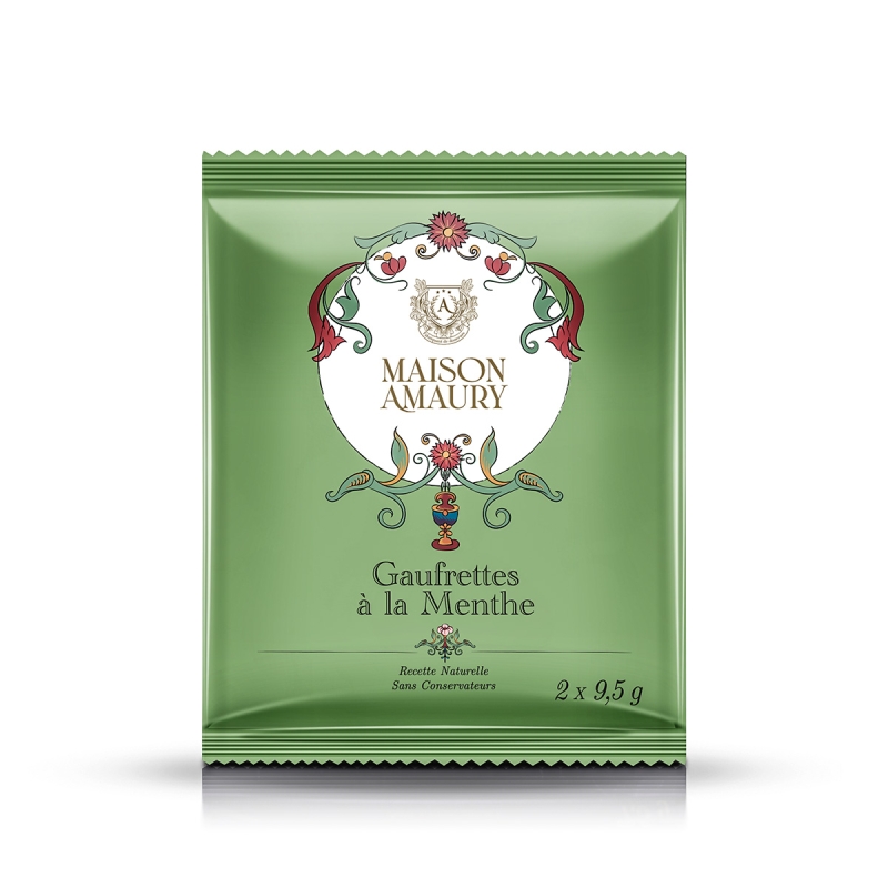 Menthe : Gaufrettes légères au parfum de menthe, renfermant une crème onctueuse aux arômes frais et subtilement aromatiques, soigneusement réunies dans une boîte de 30 pièces.